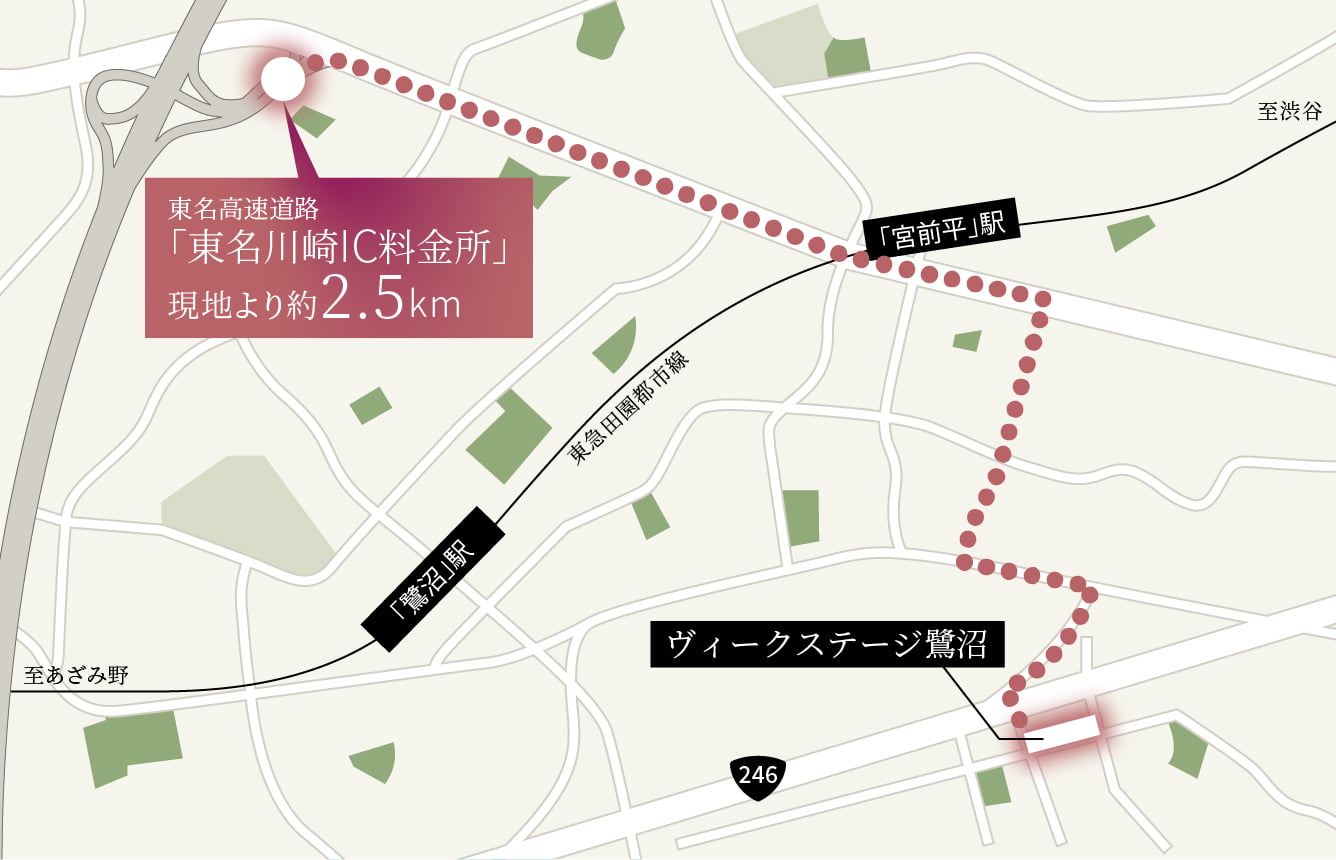 最寄りの東名川崎I.C.まで車でわずか約2.5kmという好立地で、都市部へのアクセスが非常に便利。高速道路を利用すれば、渋谷まで約16.2km、銀座へ約25.8km、新宿へも約27.9kmで到達可能。通勤やレジャー、ショッピングなど、多様な目的に対応できる優れた交通アクセスです。車を利用する方にとっては、大きな利便性を感じられる立地だと言えます。